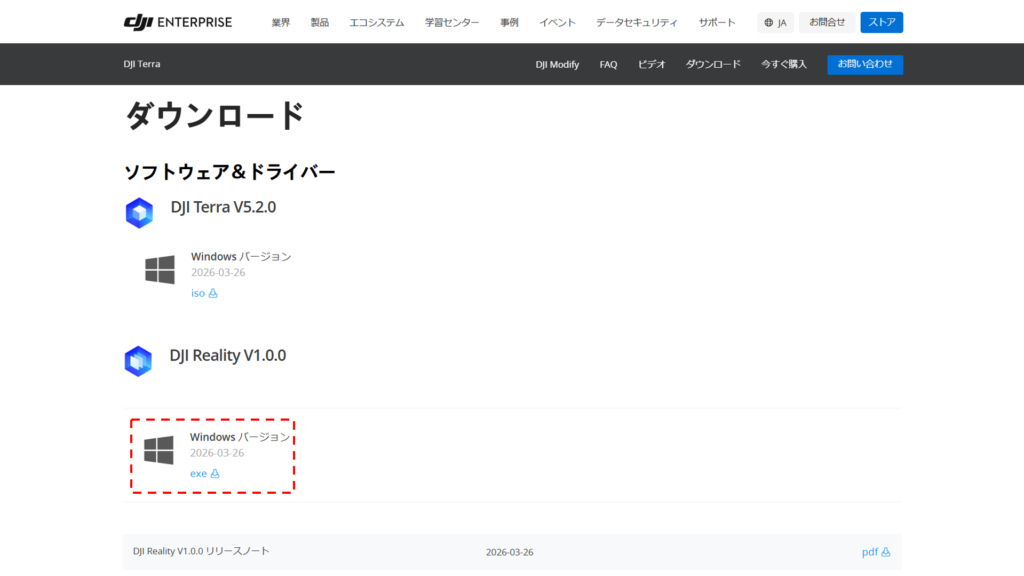 DJI Reality は独自の製品ページを持っているわけではなく、DJI Terra のダウンロードページより取得することができます。Windows 対応となりますので、ご注意ください。
