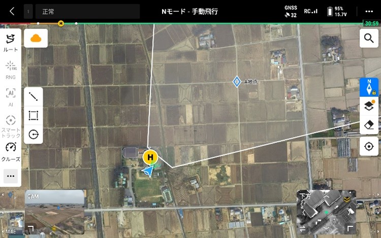 (弊社春日部施設での再現画像。左が機体カメラ映像、右が送信機マップ画面)