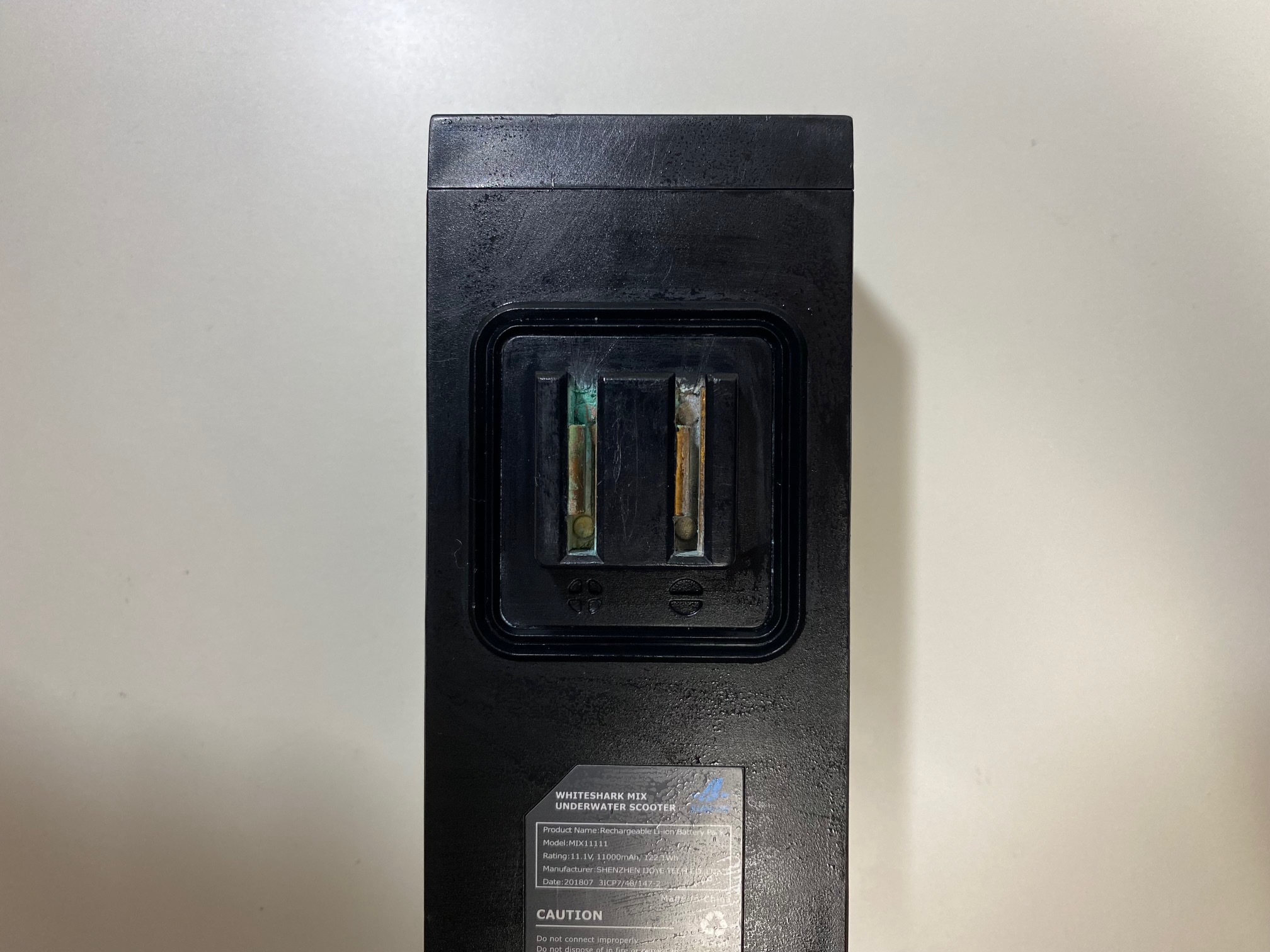 緑色(水色に見える時もあります)の汚れは、濡れたままもしくは海水成分が付着したままでの保管、湿気の多い環境にバッテリーがあった際に起こる電極の腐食現象です。