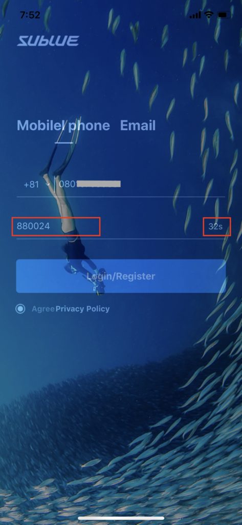 届いたコードをアプリに入力します。(入力制限時間60秒以内となります)