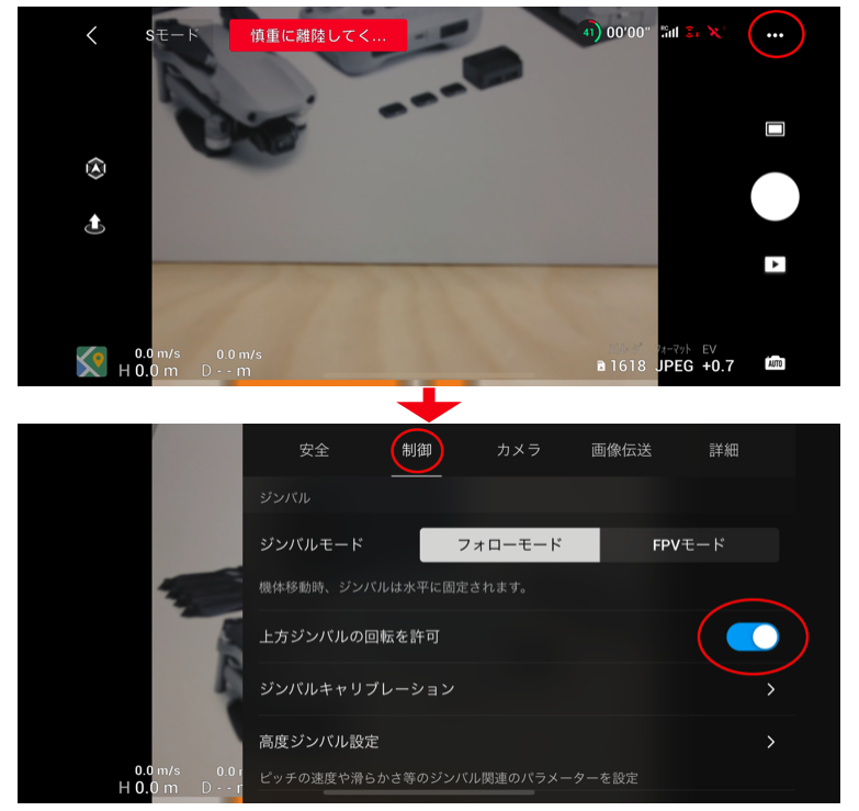 DJI FLY カメラジンバルの向きを斜め上方向に向けたい 設定可能な機種については、カメラジンバルを以下の設定で斜め上方向に任意での稼働範囲を広げることができます。 「制御」の項目の「上方ジンバルの回転を許可」より設定可能となります。 下記解説をご参考ください。 AIR 2S Q&Aの一覧に戻る AIR 2S / MAVIC AIR 2 / AIR Q&Aの一覧に戻る DJI Q&Aの一覧に戻る DJI MINI 2 Q&Aの一覧に戻る DJI MINI 3 PRO Q&Aの一覧に戻る DJI MINI 3 PRO / DJI MINI 2 / MAVIC MINI Q&Aの一覧に戻る MAVIC 3 Q&Aの一覧に戻る MAVIC 3 CLASSIC Q&Aの一覧に戻る SHARE POST LINEで送る DJI PGYTECH HOBBYWING AERO-D外付型リモートID CHASING QYSEA SUBLUE WAYDOO Unitreeユニツリー FJDynamics SAVOX SUNPADOW Firmware Updateファームウェア OTHERSその他 Q&A / 技術的なご質問 内検索: