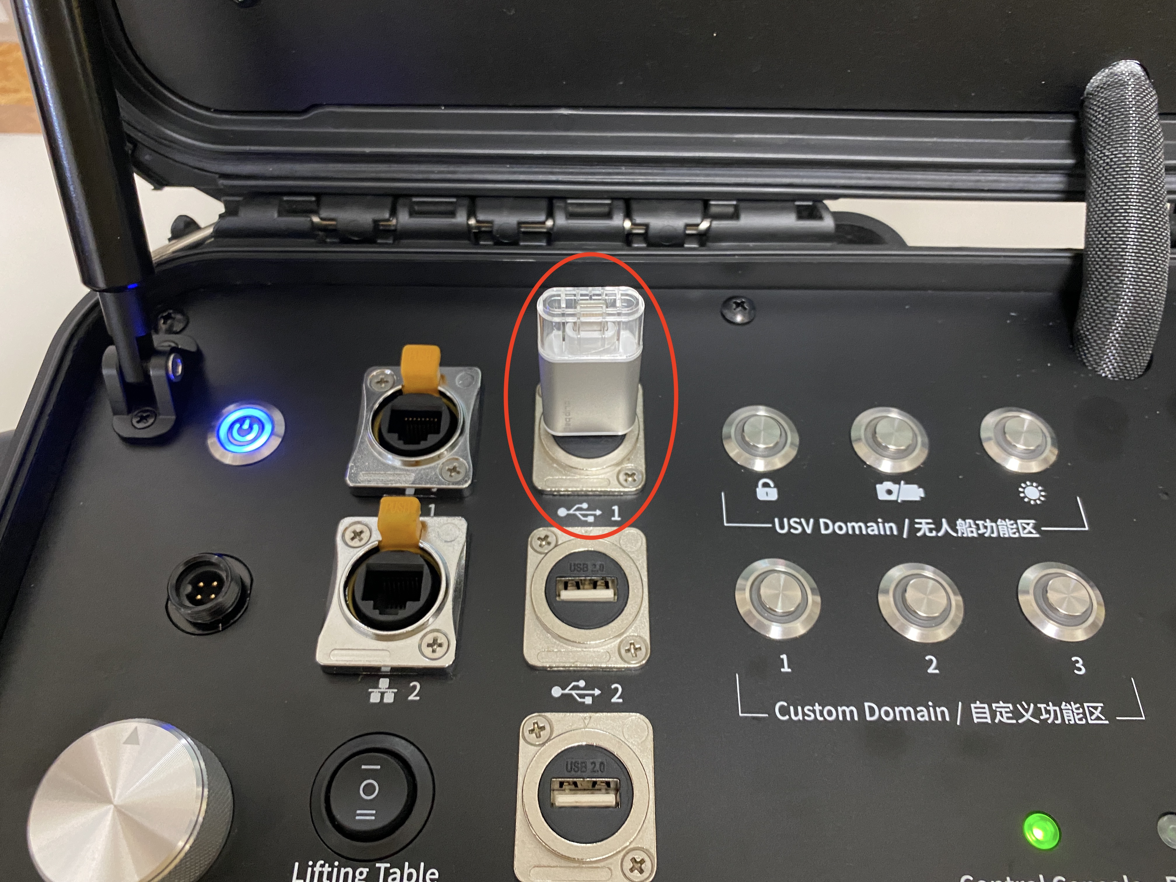 3.「コントロールコンソール・ボックス」を起動し、デスクトップ画面が表示されましたら、USBスロット(1)にUSBメモリを差し込んでください。