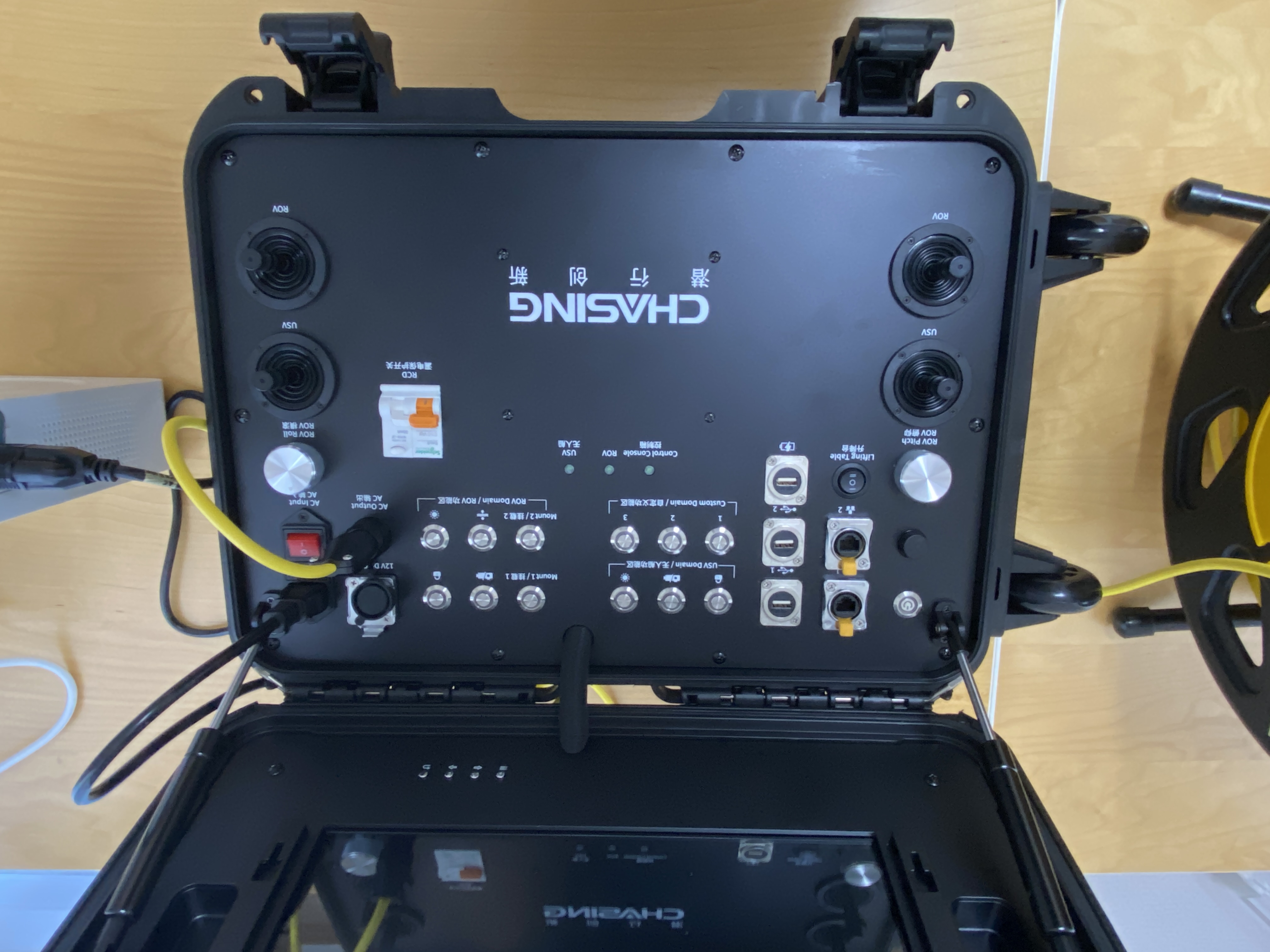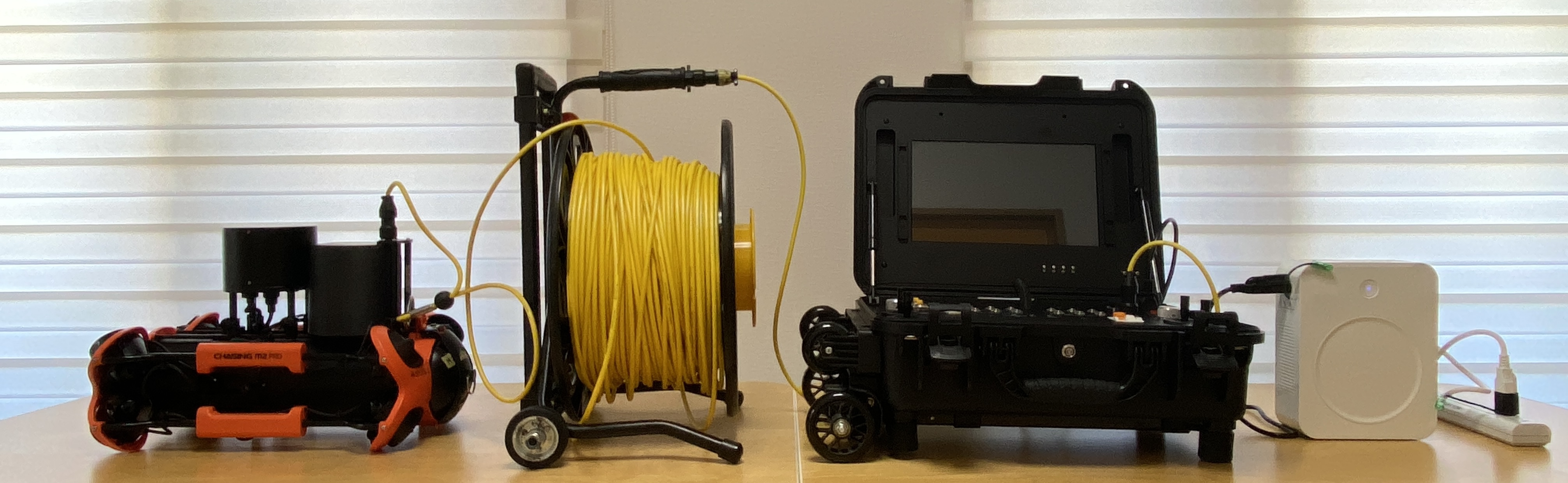 ※「コントロールコンソール」「アダプターボックス」「テザーリール」は水面から2m以上離れた位置において濡れないように保持してください。