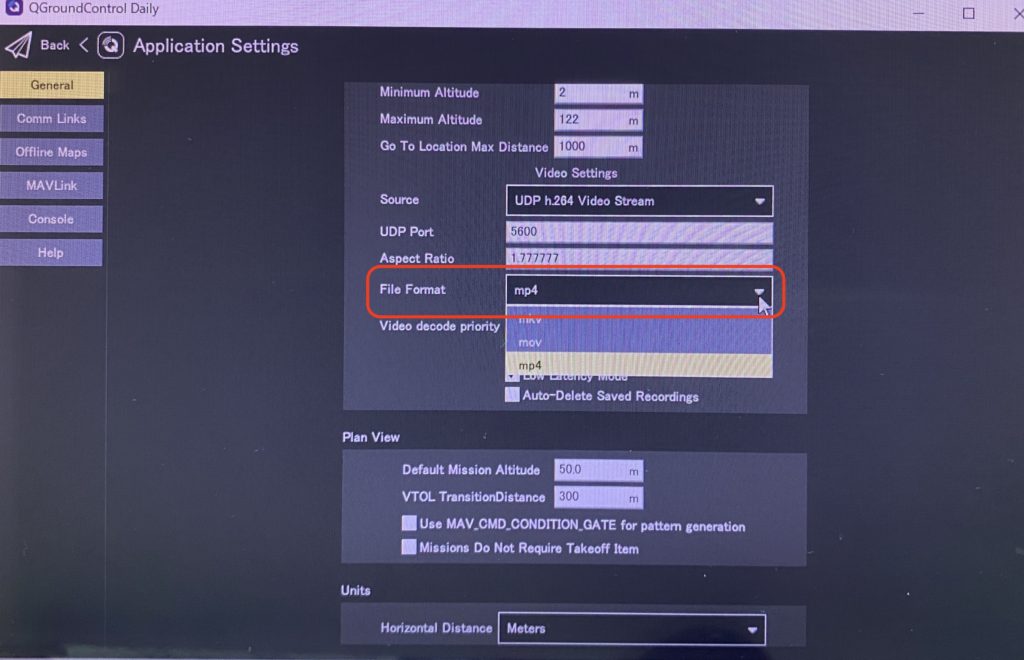 3.QGroundControl 設定画面の「General」にて「File Format」を「mp4」に設定してみてください。