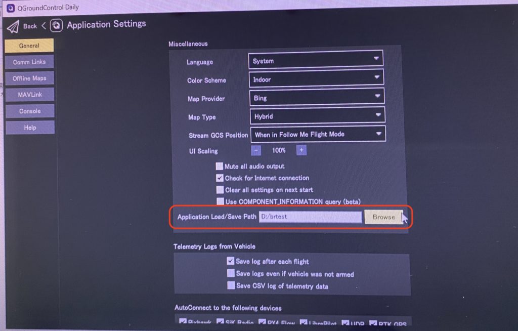 2.QGroundControl 設定画面の「General」にて「Application Load/Save Path」(撮影データ保存先設定)にて、ファイルの階層に日本語文字が入っていないかご確認ください。日本語文字が入っていると正常に動作致しません。(Windowsであると「フォルダ」階層に保存される場合があります。「フォルダ」という日本語文字がよろしくないため、CドライブやDドライブの直下に英語名のフォルダを作成いただき、保存先に指定してください)