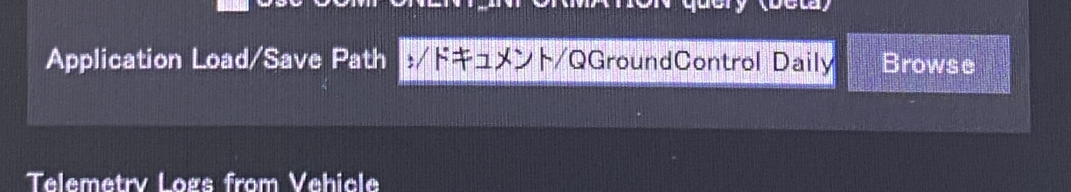 2.QGroundControl 設定画面の「General」にて「Application Load/Save Path」(撮影データ保存先設定)にて、ファイルの階層に日本語文字が入っていないかご確認ください。日本語文字が入っていると正常に動作致しません。(Windowsであると「フォルダ」階層に保存される場合があります。「フォルダ」という日本語文字がよろしくないため、CドライブやDドライブの直下に英語名のフォルダを作成いただき、保存先に指定してください)
