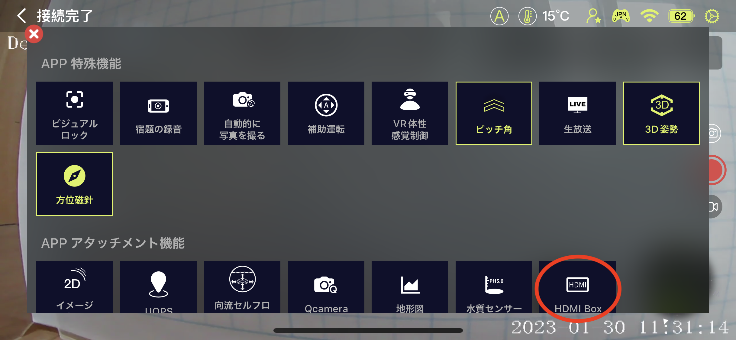 5.パイロット画面にHDMI BOXウィンドウが表示されます。「HDMI出力ボタンマーク」をクリック。映像出力まで10~20秒前後かかる場合があります。