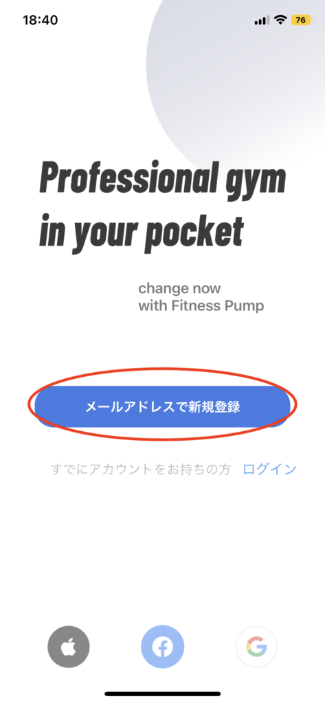 1.Fitness Pump APPを起動して「メールアドレスで新規登録」をクリック