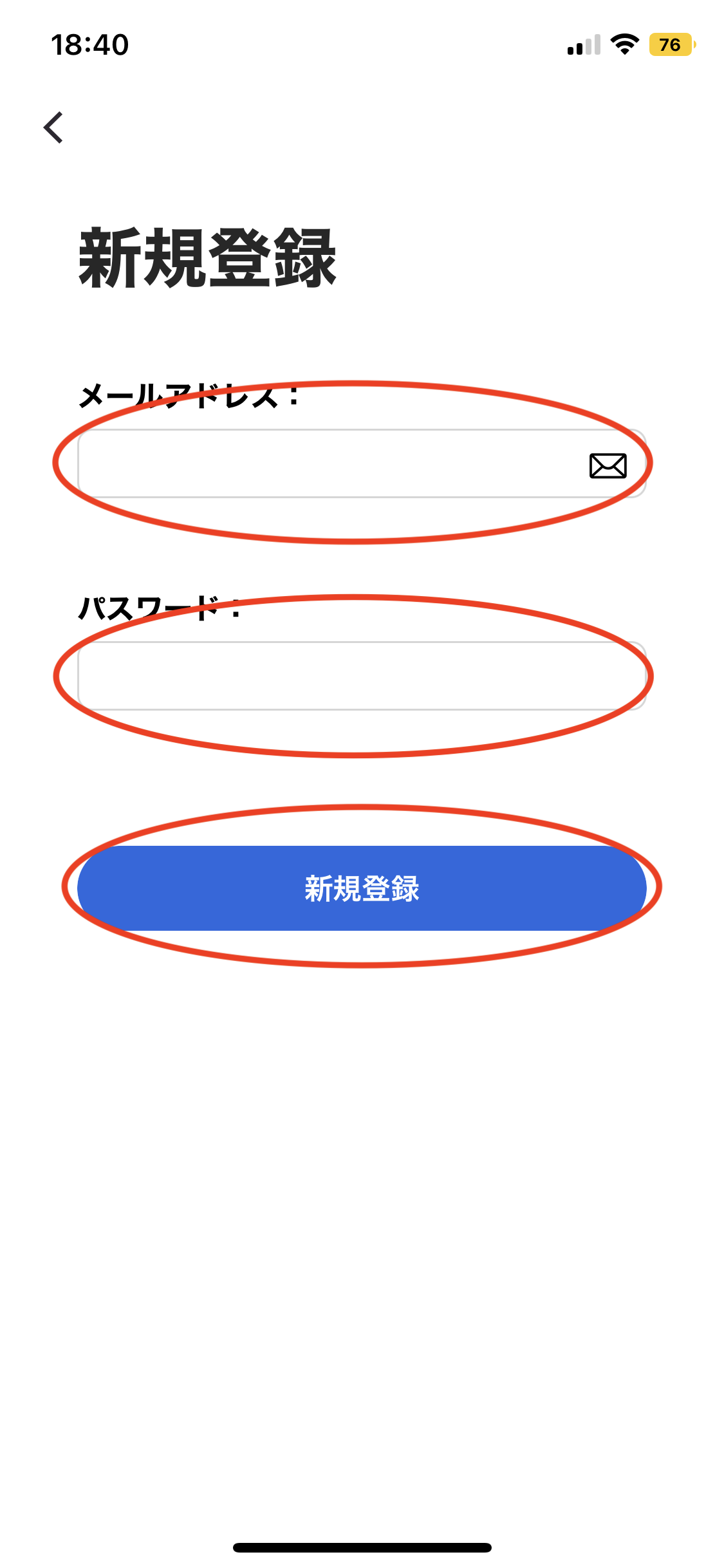 2.新規登録画面で「メールアドレス」「パスワード(任意の英数字)」を入力して