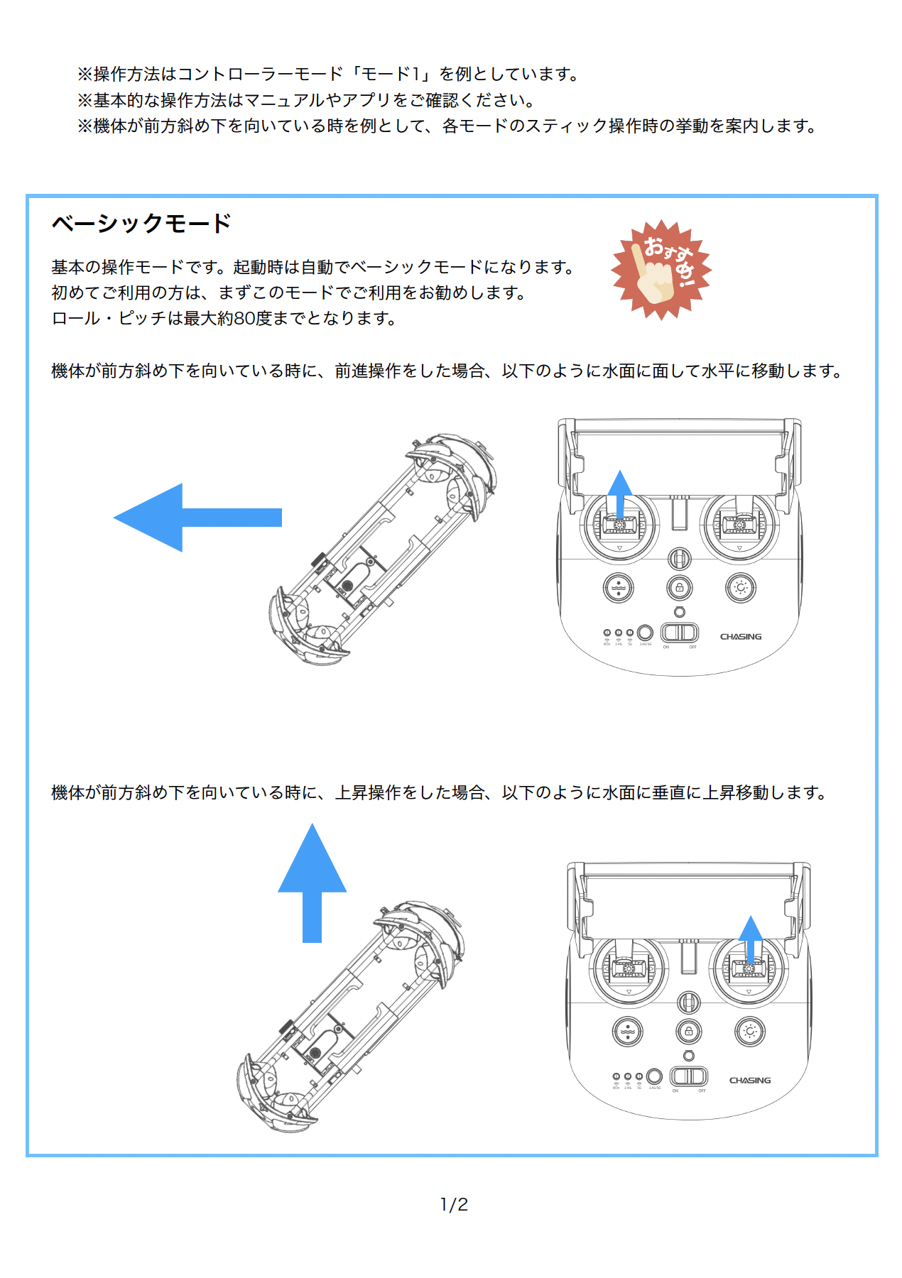 CHASING M2 シリーズ 操縦モード別 スティック操作による機体移動について CHASING M2 シリーズには操作モードが2種類あります。 ベーシックモード アドバンスモード 各モードについては以下をご確認ください。 ※当記事の無断での複製、改編、転載、二次利用などは一切禁じます。 ※記載内容は公開時点での仕様に基づいています。バージョンアップなどにより記載内容と異なる場合があります。 ※記載事項は予告なく変更となる場合があります。 CHASING Q&Aの一覧に戻る SHARE POST LINEで送る DJI PGYTECH HOBBYWING AERO-D外付型リモートID CHASING QYSEA SUBLUE WAYDOO Unitreeユニツリー FJDynamics SAVOX SUNPADOW Firmware Updateファームウェア OTHERSその他 Q&A / 技術的なご質問 内検索: