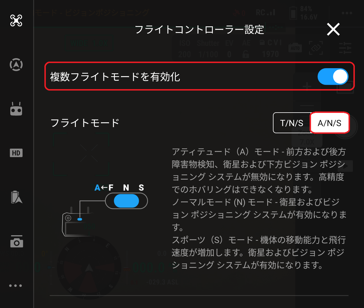 「A / N / S」を選んでいただき、そのうえで送信機の物理ボタン(フライトモードスイッチ)