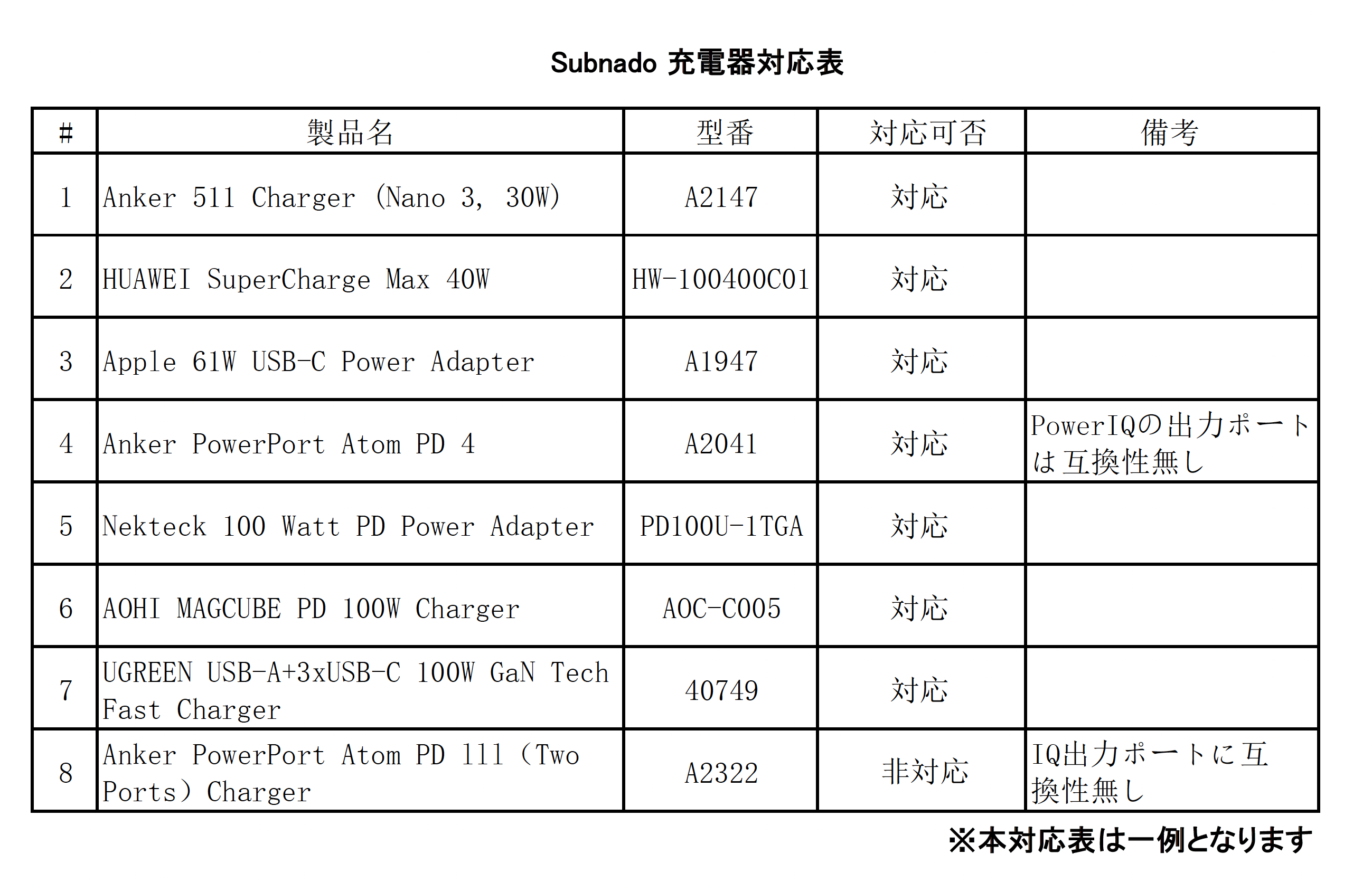 ご参考までに弊社では、以下の充電器での対応を確認いたしました。※2023年6月時点での状況となります。