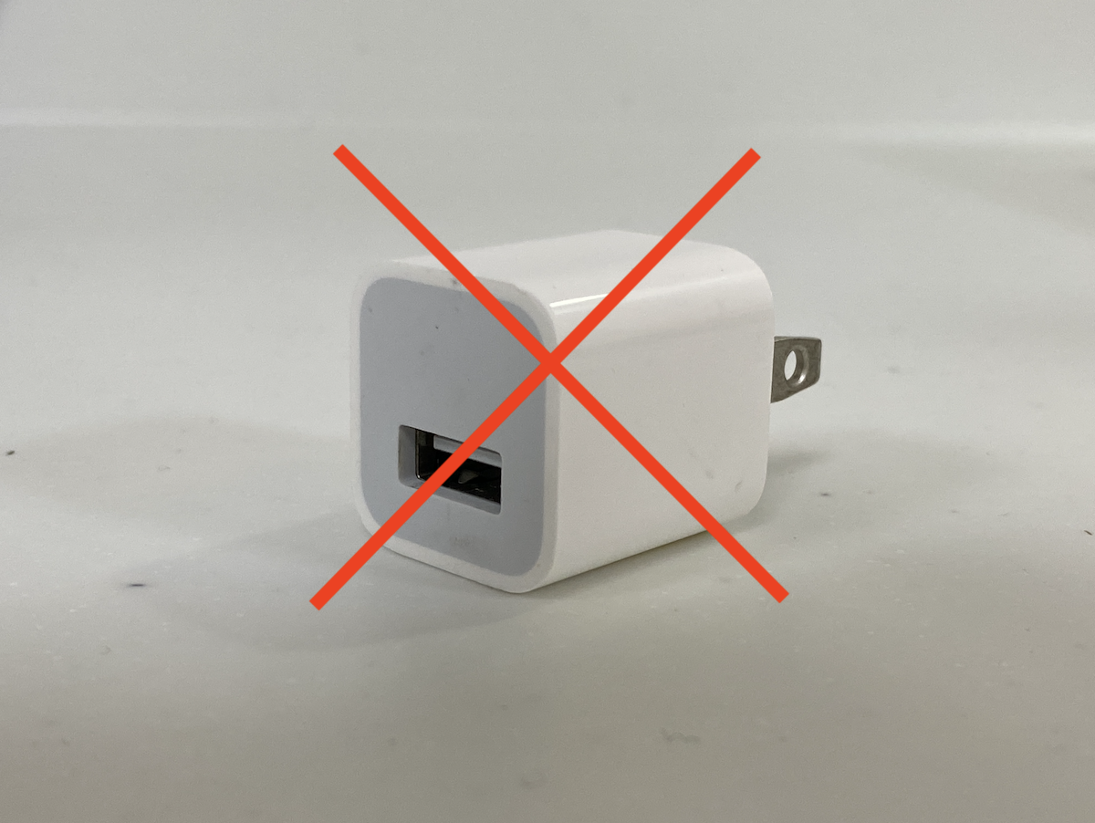 また、非対応の充電器事例として以下のiPhoneに付属している充電器(5W)についてはご利用いただけません。(充電した場合でも正常に充電できない・最後まで充電できない等が発生する場合がございます)