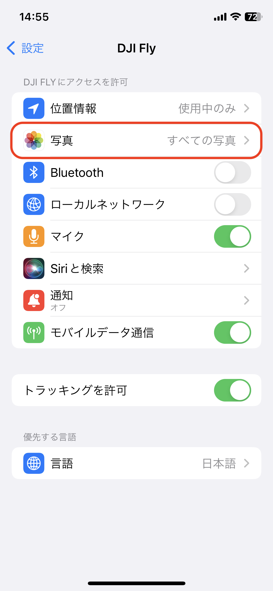 携帯端末の設定で、DJI Flyアプリに「写真」へのアクセスを許可してください。