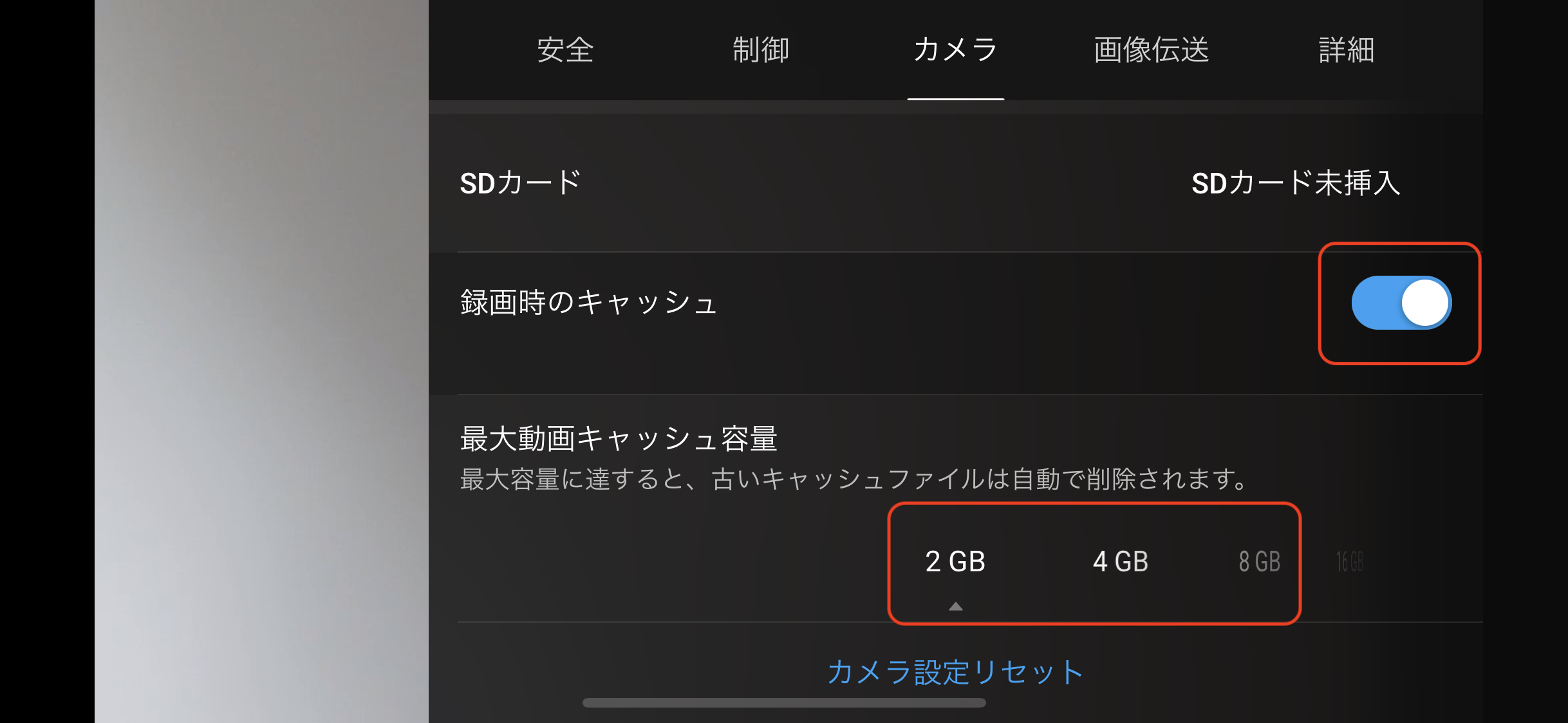 ・「録画時のキャッシュ」をON/「最大動画キャッシュ容量」で任意の容量を選択