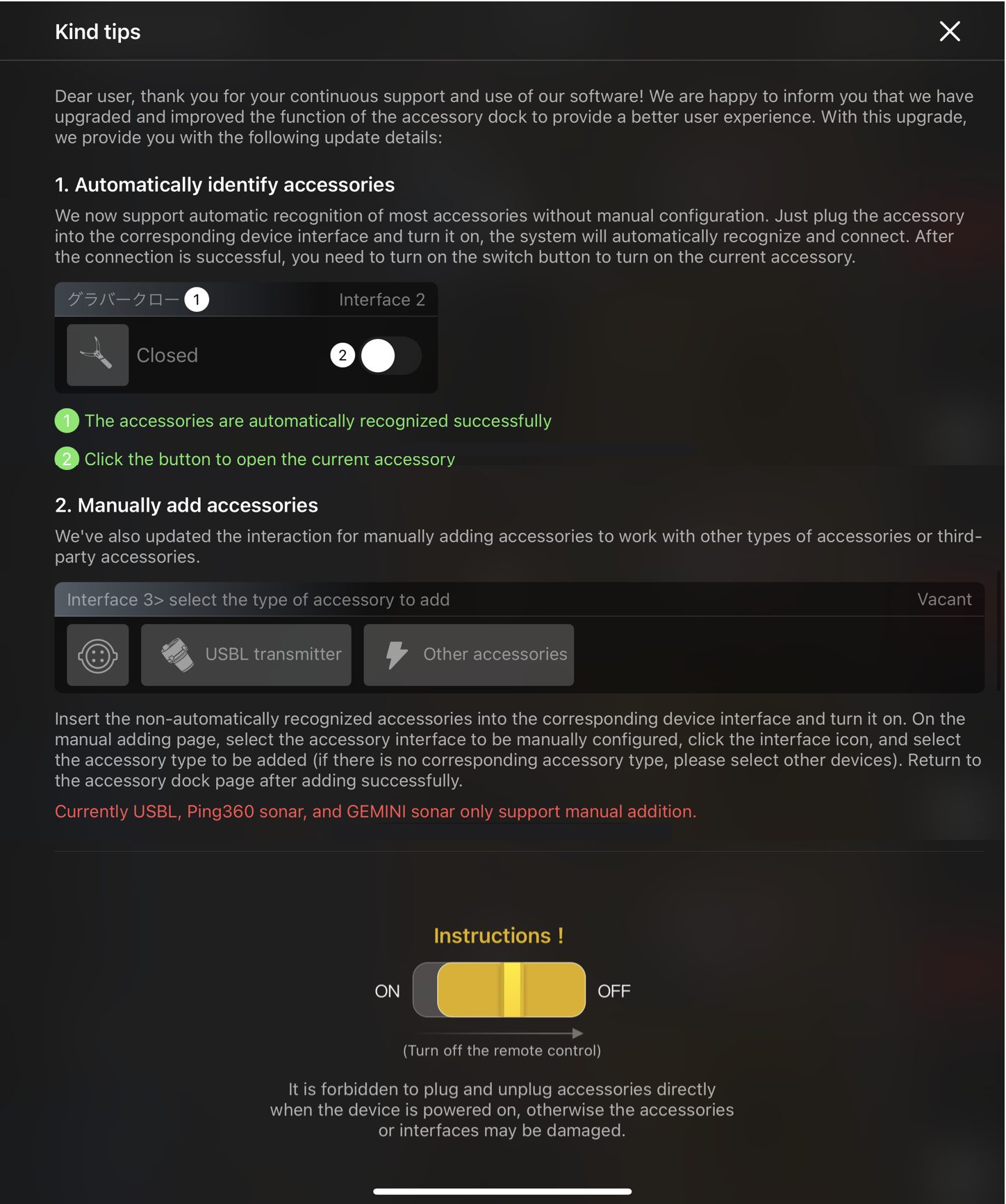 <本体ファームウェアVer.1.6.6 以降 かつ CHANSHING GO1アプリVer.4.90.以降 場合>にアクセサリーを使用すると出ることがある案内表示です。