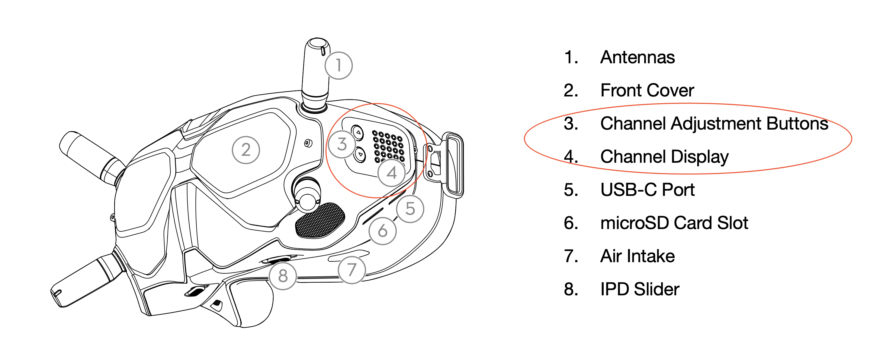 DJI FPV Goggle V2 の本体側面にある「Channel Adjustment Buttons」「Channel Display」ついて